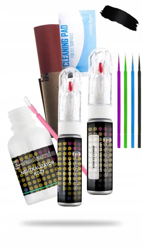 Pełny zestaw zawiera wszystko co potrzeba do wykonania naprawy lakierniczej lub przemalowania elementu.