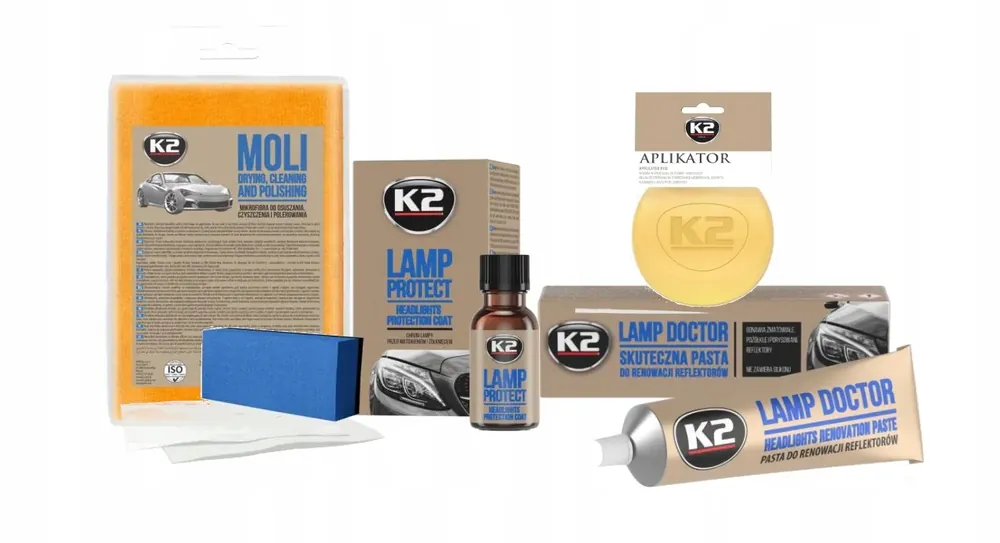 Zestaw kosmetyków K2 do regeneracji i pielęgnacji lampreflektorów.