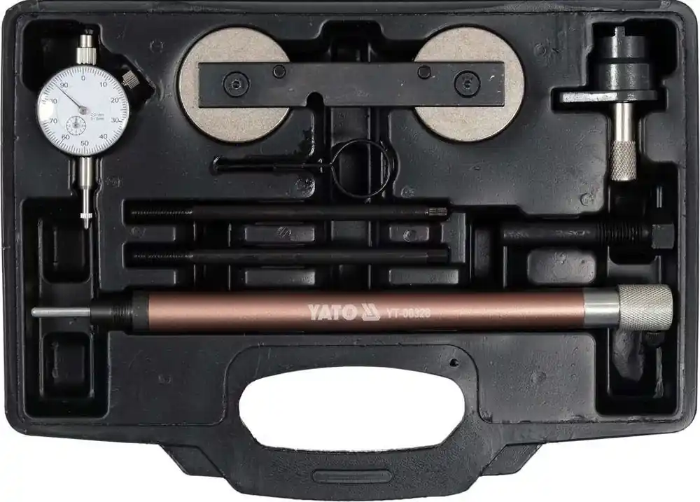 do układu rozrządu|do silników benzynowych Zawartość zestawu: zegar|wskaźnik TDC|narzędzie do osiowania wałka rozrządu|pin napinający|trzpień ustalający położenie wału korbowego|piny prowadzące Dokładność pomiarowa: ± 0. 01 mm Marki samochodów: samochody z grupy V. A. G. Liczba sztuk w zestawie: