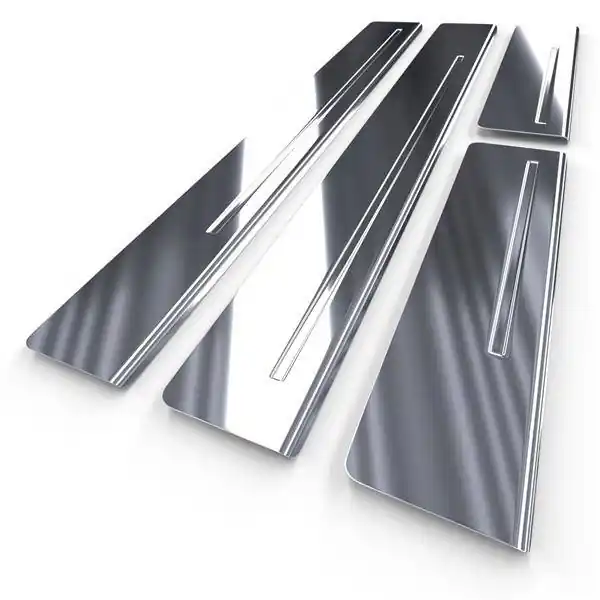 - Srebrne dedykowane nakładki na progi samochodowe ze stali kwasoodpornej tłoczone są w precyzyjnie zaprojektowanych matrycach wytwarzanych przez obrabiarki CNC i wycinane przy użyciu najnowocześniejszego lasera światłowodowego, co gwarantuje ich doskonałe dopasowanie do progów danego modelu auta.