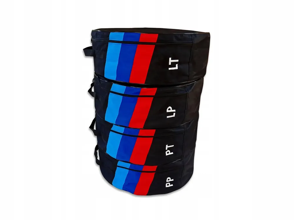 Poniżej przedstawiamy pokrowce na opony/ całe koła w wersji „STANDARD”, wykonane z mocnego nieprzemakalnego materiału powleczonego PVC o nazwie kodura. Pokrowce zaprojektowane i wykonane są przez firmę LASOTA, dopasowane odpowiednio do rozmiaru opon podanego na aukcji. Do produkcji pokrowców użyte zostały materiały najwyższej jakości, takie jak: nici kaletnicze, zamek pętelkowy 0,5 cm , biza kaletnicza oraz pas nośny dokoła pokrowca o grubości 40mm, o udźwigu kilkuset kilogramów, dzięki czemu bez obaw można w pokrowcach przenosić nie tylko same opony , ale również opony na felgach. Pokrowce naszej firmy ułatwiają przenoszenie, przewożenie i estetyczne przechowywanie opon, oraz całych kół przez długie lata. Dodatkowo każdy pokrowiec posiada wyhaftowany napis z oznaczeniem opony (np. PT – prawy tył itd).