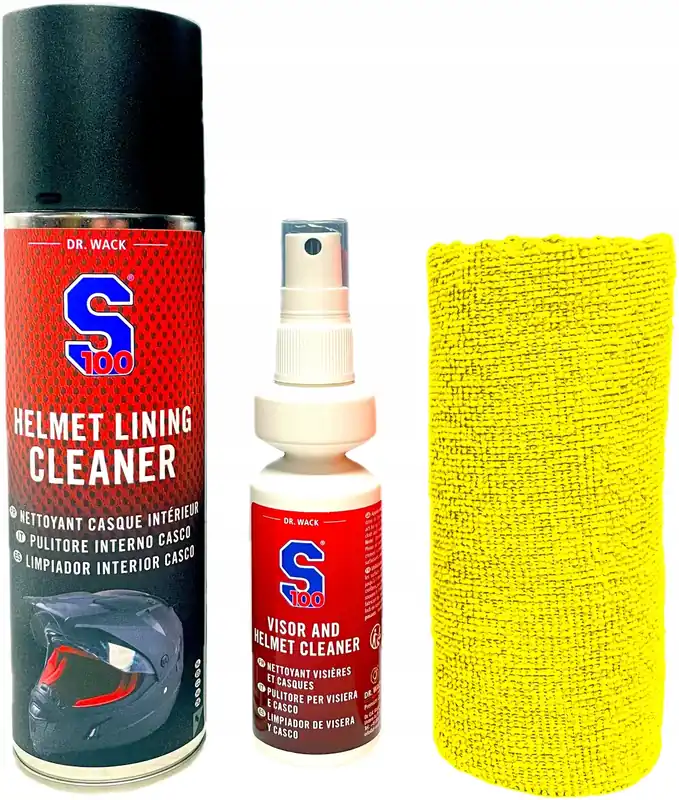 Środek do czyszczenia wnętrza kasków S100 Helmet Interior Cleaner 300 ml (189090) + Preparat do czyszczenia wizjera i kasku S100 Visor & Helmet Cleaner 100 ml (318695) + ściereczka z mikrofibry